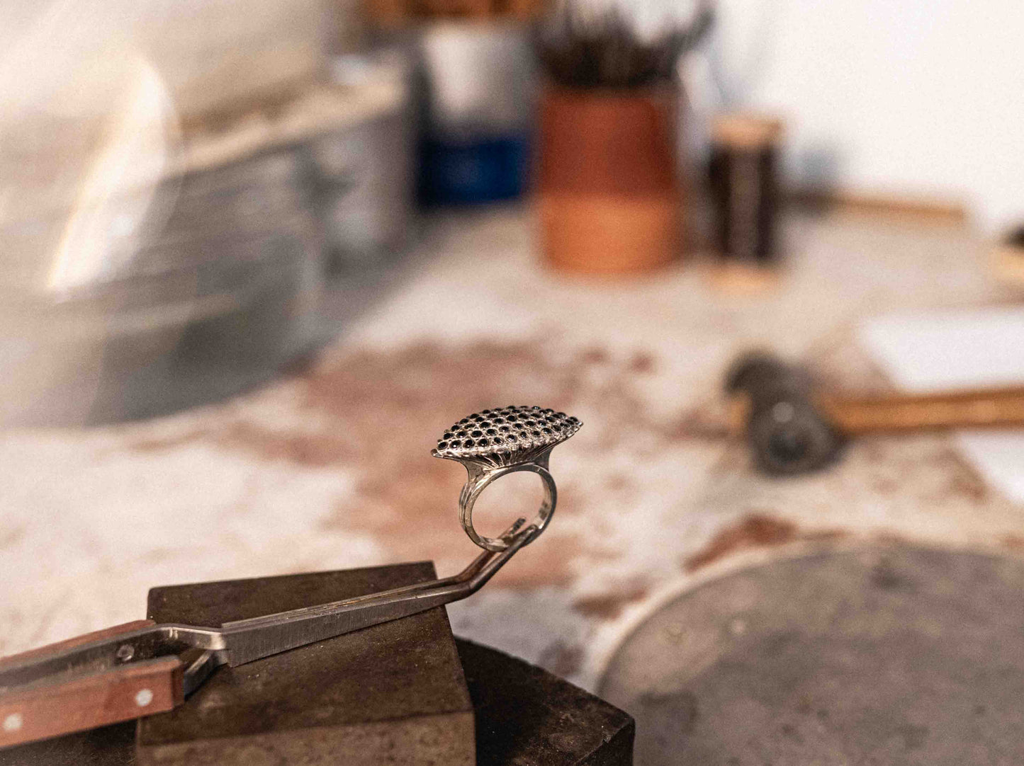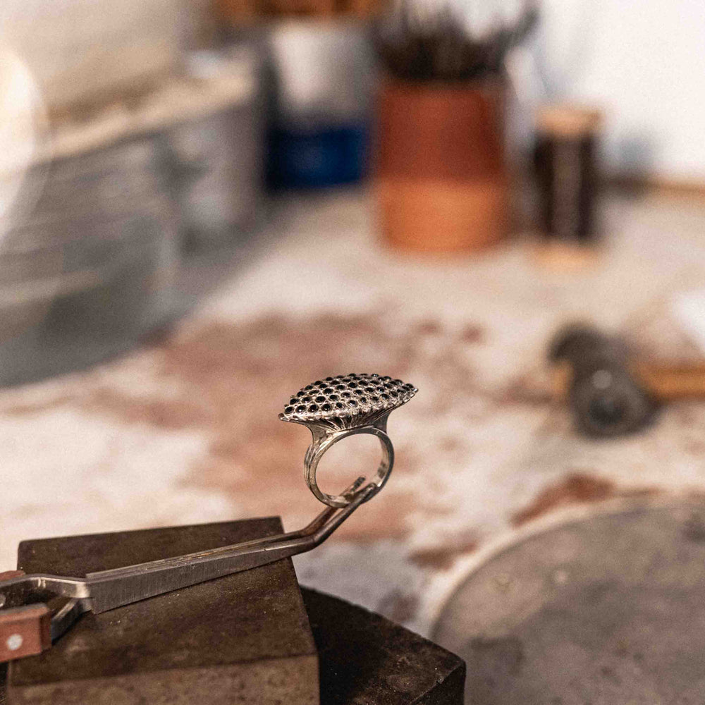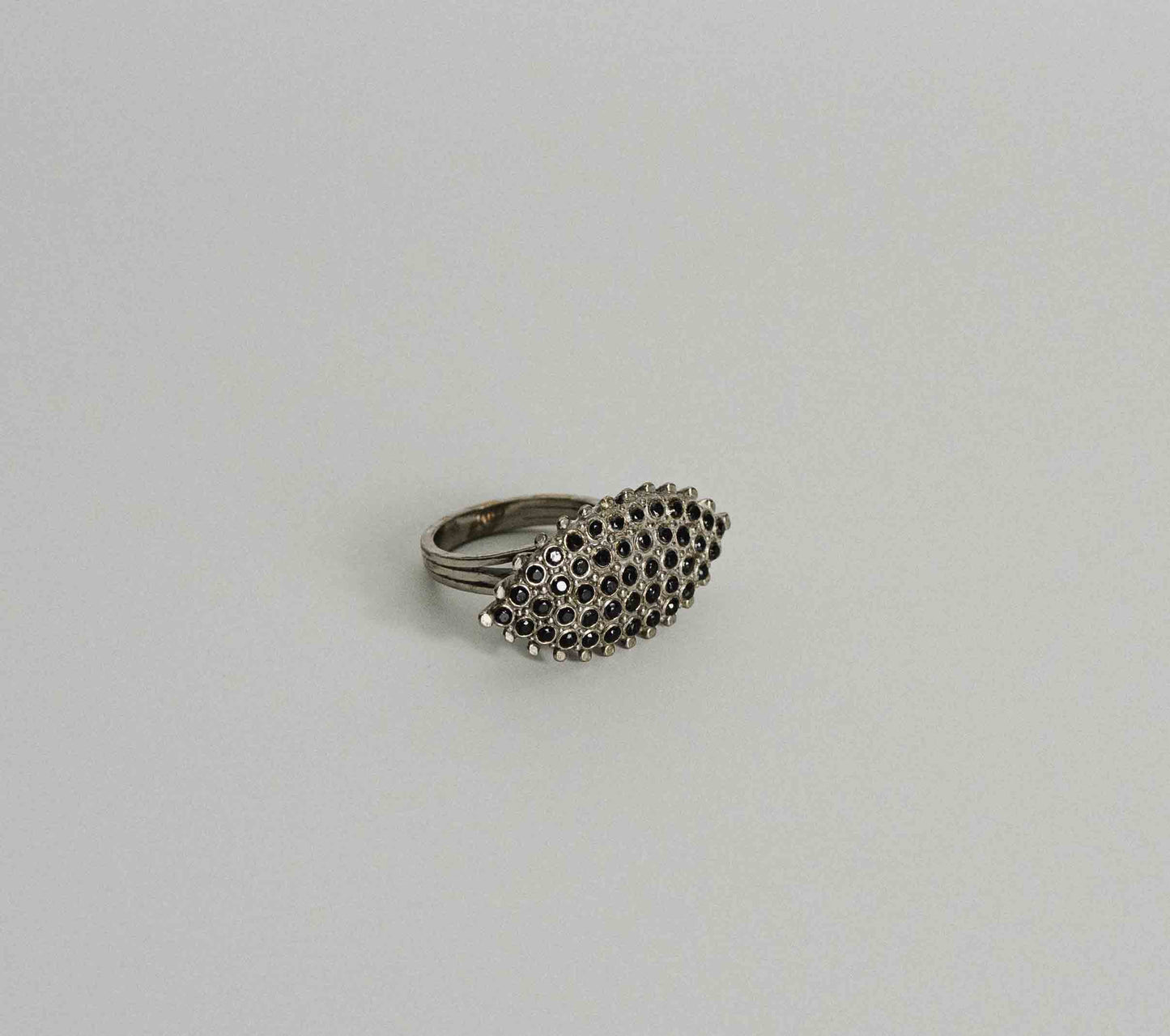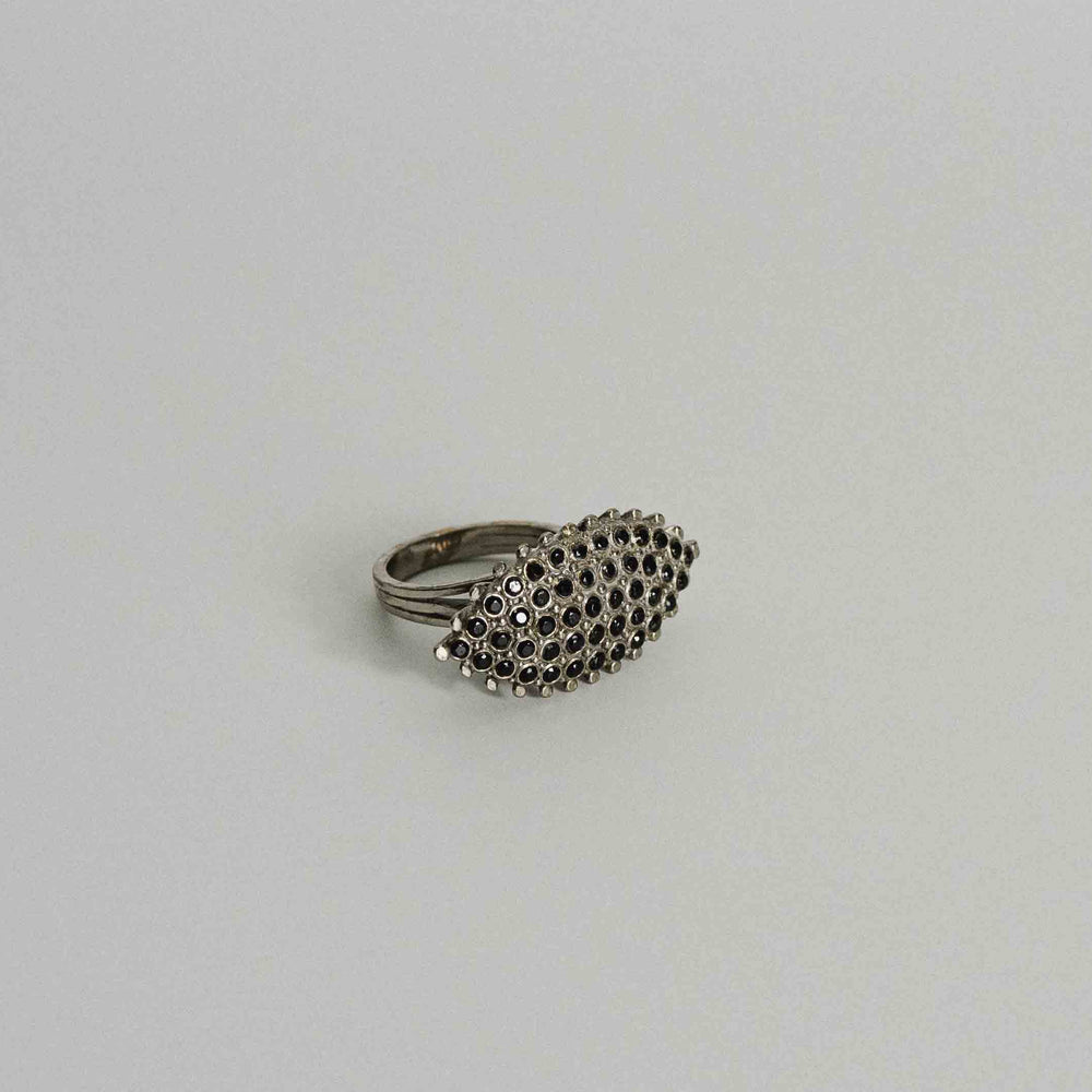 Frac is one of our most special pieces, a ring with certain aspects of a classic jewel due to its pave setting, with black zircons all over the upper part of the ring, but at the same time a totally transgressive and different design.